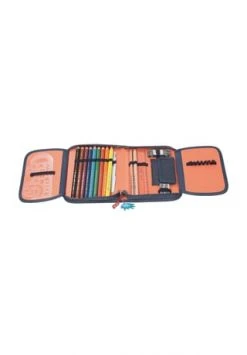 Beschriftungsetikett, Stiftschlaufe und Einstecktasche im Vorderdeckel