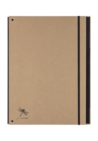 Pultordner für Dokumente im Format A4. Der Einband aus stabilem Graukarton ist mit recycelbarem Kraftpapier überzogen und hat einen dehnbaren Rücken. Die reißfesten Seiten aus schwarzem Karton sind mit schwarzen neutralen Taben aus langlebigem PP und drei Schaulöchern im Buchblock ausgestattet. Die Mappe zeigt eine dezente, schwarze Prägung einer Libelle und hat einen zusätzlichen Verschluss mit Gummizug.