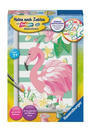 Farbige Motivlinien: Größerer Malspaß & ein schöneres Ergebnis Dank der farbigen Motivlinien, können die Kinder das ganze Motiv Think Pink und die Farben schneller erkennen. Der Pinsel hat eine gute Führung und so entsteht nach und nach ein perfektes Bild.Die schönen Motive zum Ausmalen sind eine tolle Geschenkidee für Kinder ab 7 Jahren und eine schöne Dekoration für das Kinderzimmer. In diesem Malset sind bereits 10 fertig gemischte Acrylfarben enthalten.Mit Malen nach Zahlen von Ravensburger lernen die Kinder Flächen sorgfältig auszumalen, ihr Maltalent zu verbessern sowie feinmotorische Fähigkeiten zu entwickeln. Am Ende stehen Freude, Stolz und ein Erfolgserlebnis, das die Lust am Weitermalen weckt.Die Motive sind altersgerecht in drei Schwierigkeitsstufen umgesetzt: von einfachen Bildern mit wenigen, großen Malflächen bis hin zu Bildern mit vielen, kleinen Malflächen für Fortgeschrittene.Jedes Malset enthält alles, was Künstler zum Malen brauchen und es ist kein Mischen der Farben notwendig.Das Ravensburger Malen nach Zahlen Programm bietet eine große Motivauswahl für Kinder und Erwachsene.