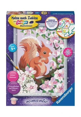 Dank der farbigen Motivlinien, können die Kinder das putzige Motiv „Neugieriges Eichhörnchen“ in seiner Gänze und die Farben schneller erkennen. Der Pinsel hat eine gute Führung und so entsteht nach und nach ein perfektes Bild. Das süße Motiv mit den prächtigen Kirschblüten zum Ausmalen ist eine tolle Geschenkidee für Kinder ab 9 Jahren und eine schöne Dekoration für das Kinderzimmer. In diesem Malset sind bereits 15 fertig gemischte Acrylfarben enthalten. Mit Malen nach Zahlen von Ravensburger lernen die Kinder Flächen sorgfältig auszumalen, ihr Maltalent zu verbessern sowie feinmotorische Fähigkeiten zu entwickeln. Am Ende stehen Freude, Stolz und ein Erfolgserlebnis, das die Lust am Weitermalen weckt. Dieses Malset enthält alles, was Künstler zum Malen brauchen und es ist kein Mischen der Farben notwendig. Zusätzlich zur Maltafel, zu den Farben und zum Pinsel, ist in diesem Malset funkelnder Glitter enthalten. Sobald das Motiv fertig ausgemalt ist, wird der Glitter angemischt und aufgetragen. So wird das Motiv zum Glitzern gebracht.