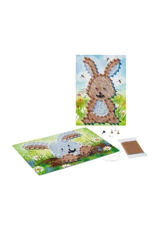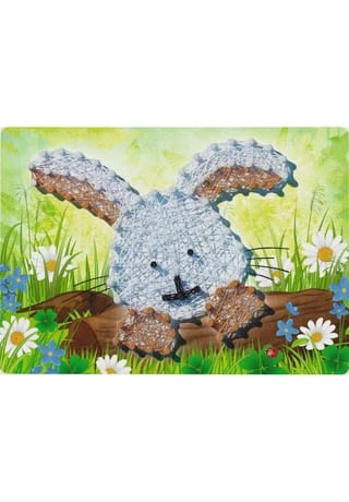 Mit dem Ravensburger String it-Set Rabbit erlernen bereits Kinder ab 6 Jahren die beliebte Technik String Art. Hier werden keine Nägel eingeschlagen, sondern Kunststoffpins eingedrückt. Sind alle Pins gesteckt, werden auf der Vorderseite der Tafel die bunten Fäden ganz nach Belieben kreuz und quer gespannt, bis das Fadengeflecht das Motiv erscheinen lässt. Wann das Fadenbild fertig ist, entscheidet jeder selbst. String Art ist wieder voll im Trend. Mit dem Ravensburger String it-Set erlernen bereits Grundschulkinder die beliebte Technik. Das geht ganz einfach: Auf der Rückseite der Motivtafeln sind die Löcher farbig umrandet, entsprechend der vorgesehenen Pin-Farbe. Sind alle Pins gesteckt, werden auf der Vorderseite der Tafel die farblich passenden Fäden ganz nach Belieben kreuz und quer gespannt, bis das Fadengeflecht das Motiv erscheinen lässt. Wann das Bild fertig ist, entscheidet jeder selbst. Das Netz kann dabei ganz dicht sein oder auch mit vielen Zwischenräumen. Im Set enthalten sind Kunststoffpins in unterschiedlichen Farben, zwei Motivtafeln mit Vorlage sowie Garn auf Haspeln in verschiedenen Farben.