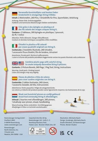 Mit dem Ravensburger String it-Set „Dogs“ erlernen bereits Kinder ab 7 Jahren die beliebte Technik String Art. Hier werden keine Nägel eingeschlagen, sondern Kunststoffpins eingedrückt. Sind alle Pins gesteckt, werden auf der Vorderseite der Tafel die bunten Fäden ganz nach Belieben kreuz und quer gespannt, bis das Fadengeflecht das Motiv erscheinen lässt. String Art ist wieder voll im Trend. Mit dem Ravensburger String it-Set erlernen bereits Grundschulkinder die beliebte Technik. Das geht ganz einfach: Die Löcher der Motivtafeln sind auf der Rückseite farbig umrandet. So ist leicht zu erkennen, welcher Pin an welche Position kommen soll. Sind alle Pins gesteckt, werden auf der Vorderseite der Tafel die farblich passenden Fäden ganz nach Belieben kreuz und quer gespannt, bis das Fadengeflecht das Motiv erscheinen lässt. Wann das Bild fertig ist, entscheidet jeder selbst. Das Netz kann dabei ganz dicht sein oder auch mit vielen Zwischenräumen. Im Set enthalten sind Kunststoffpins in unterschiedlichen Farben, zwei Motivtafeln mit Vorlage sowie Garn auf Haspeln in verschiedenen Farben.