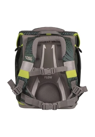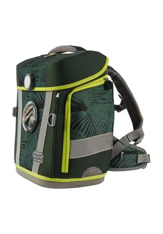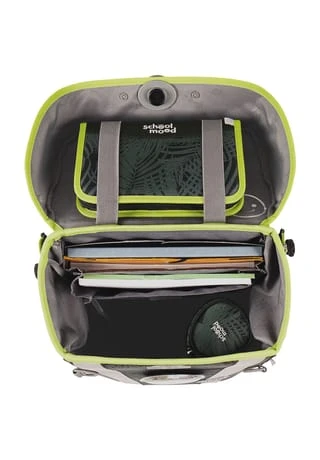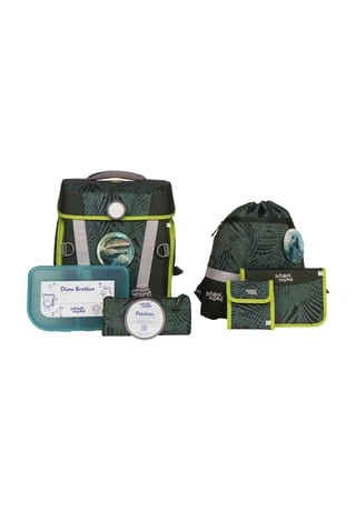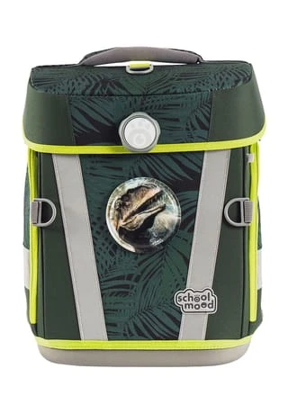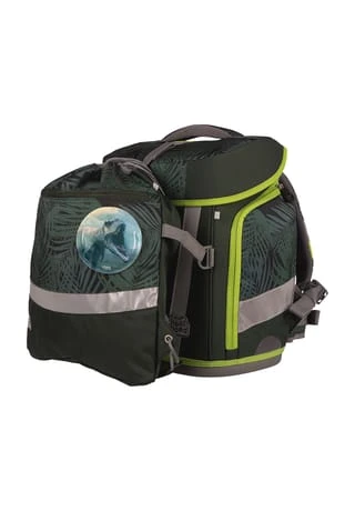 Der Ranzen ist dank selbstschließendem „FidLock“-Magnetverschluss kinderleicht zu Öffnen und zu Schließen. Darüber hinaus gibt es ein geräumiges Hauptfach mit integriertem Bücherfach, das schwere Bücher nah am Rücken hält und für eine möglichst entlastende Gewichtsverteilung sorgt. Zwei große, isolierte Reißverschluss-Außentaschen halten Trinkflasche und Brotdose stets griffbereit (mit integriertem Ablaufnetz, sollte die Trinkflasche einmal undicht sein). Eine kleine Reißverschlusstasche in der rechten Beckenflosse bietet Platz für Haustür- oder Fahrradschlüssel. Zudem existieren 3 Halterungen, an denen der Turnbeutel fixiert werden kann. Für die individuelle Gestaltungsmöglichkeiten sorgen 2 starke, wechselbare Dino-Patchies und 1 Blanko-Patchy. Besondere Zugabe: das Etui mit holzfreien Bunt- und Bleistiften aus recyceltem Material.