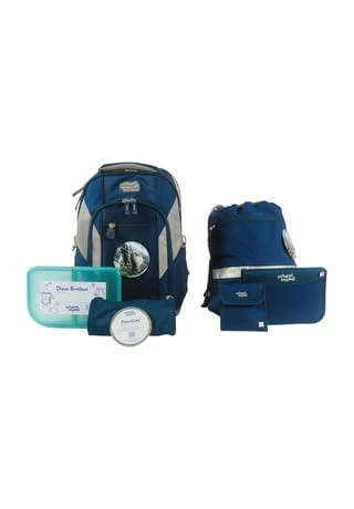 Schulranzen, Sportbeutel, Schlamperrolle, Federmäppchen (1 Klappe gefüllt), Brotdose, 3 Patchies
