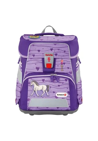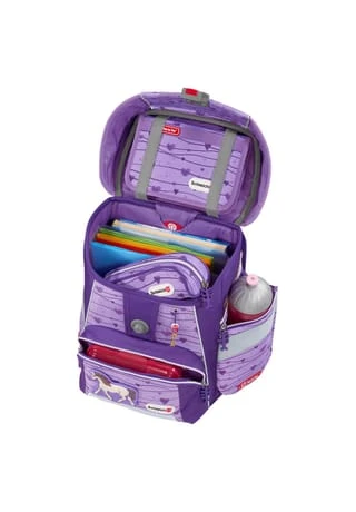 Die Limited Edition „Space Schleich“ ist Teil einer Kooperation mit dem Spielzeughersteller Schleich. Der Space Schleich mir zauberhaften Schleich-Motiven begeistert durch besonders leichtes Material, großes Fassungsvermögen und das höhenverstellbare Tragesystem, das sich Ihrem wachsenden Kind anpassen kann. Die ergonomische Rückenpartie, das Rückenpolster, sowie Hüftflosse, Brustgurt und Lageverstellriemen sorgen für ein optimales Trageerlebnis. Für die individuelle Gestaltung können Magic Mags, ganz nach dem Geschmack Ihres Kindes, angebracht werden. Im geräumigen Hauptfach, das mit praktischem Fidlock-Magnetverschluss geschlossen wird, gibt es jede Menge Platz für alles, was im Unterricht gebraucht wird, zusätzlich können die zwei Seitentaschen nach außen wachsen und so im Inneren für genügend Stauraum sorgen. Das Mäppchen kann platzsparend im Schulranzen-Deckel verstaut werden. Set bestehend aus: Schulranzen, Federmäppchen (komplett bestückt mit Markenstiften), Schlamperetui, Sportbeutel und 3-teiligem Magic Mags Set. Schulranzen Außenmaß: 28 cm x 20 cm x 37 cm / Gewicht: ca. 1250 g / Volumen: ca. 20 l